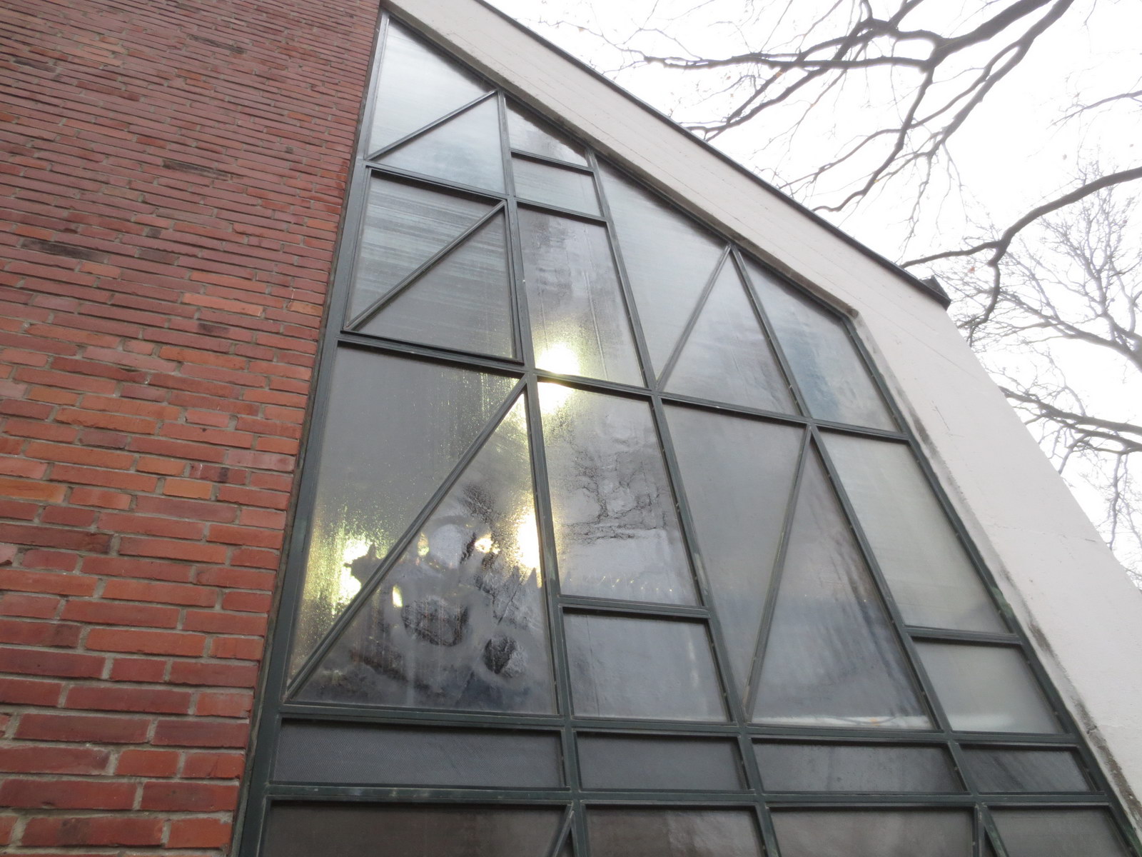 gesprungenen Glasscheiben aus gewalztem Rohglas (Rahmen und Verglasung stammen aus der Erbauungszeit von 1965)
